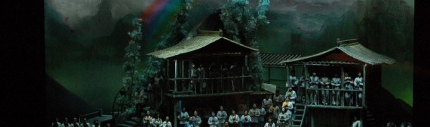 舞台中央是旋转舞台上的写实道具,而环幕上层峦叠嶂的巍峨群山以及掩映其中的以土黄和墨绿为主色调的山村,一切景象如同真物再造,一虚一实,把一个恬静的南国山村活生生地搬上了舞台。用高广健的话说,这样的设计共同体现出了一个中国画意味的田园风光。通过舞台前后各种景物的搭配和多角度的组合,使得这种水墨画的效果尤为突出。但是仔细看去所有的景物又跟现实不一样,尤其是在颜色上,都有所弱化,为的就是能够更好地突出演员。